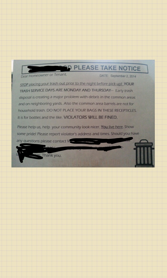 STOP placing your trash out prior to the night before pick up! YOUR TRASH SERVICE DAYS ARE MONDAY AND THURSDAY– Early trash disposal is creating a major problem with debris in the common areas and on neighboring yards. Also the common area barrels are not for household trash. DO NOT PLACE YOUR BAGS IN THESE RECEPTICLES [sic]. It is for bottles and the like. VIOLATORS WILL BE FINED.