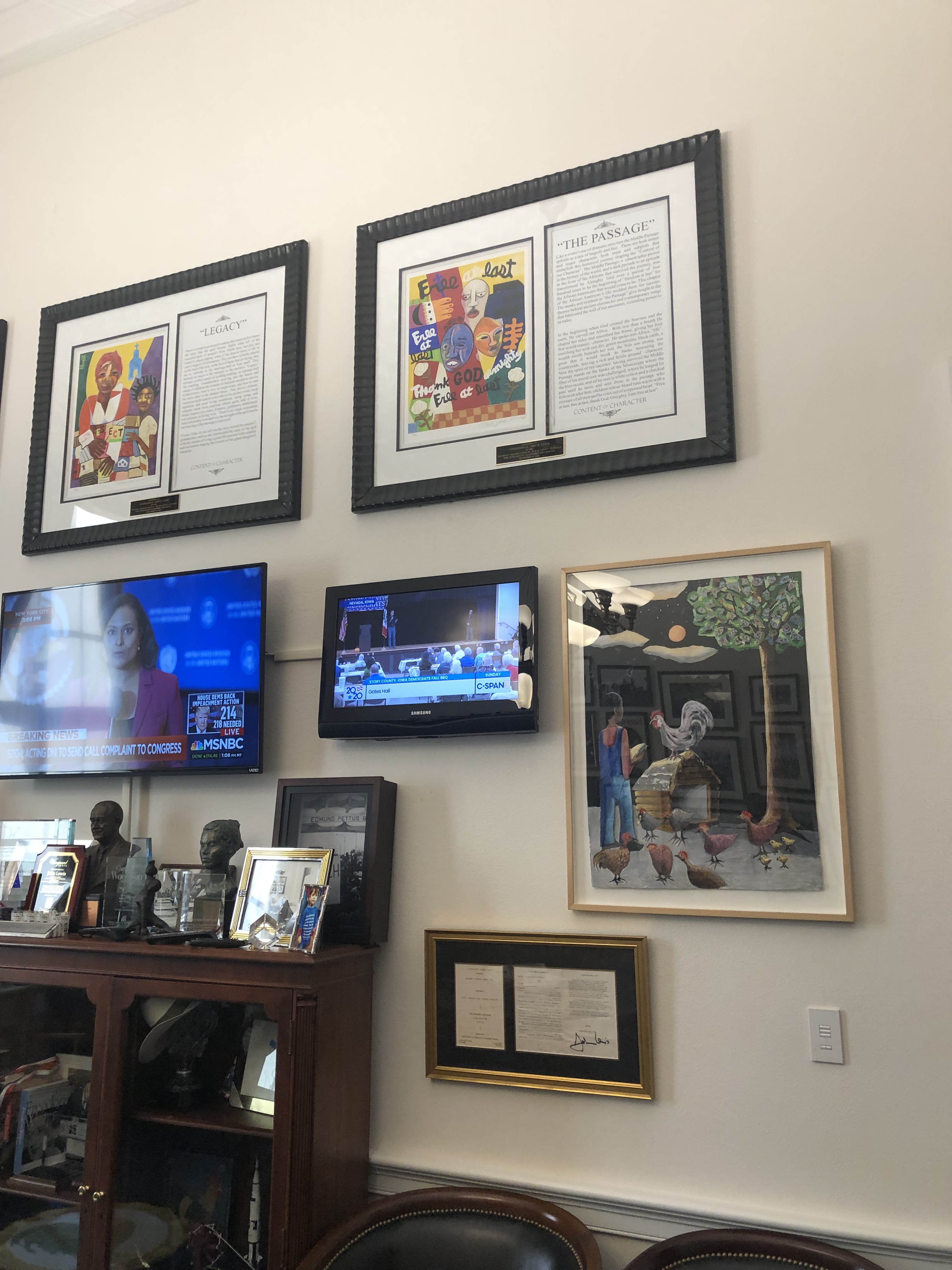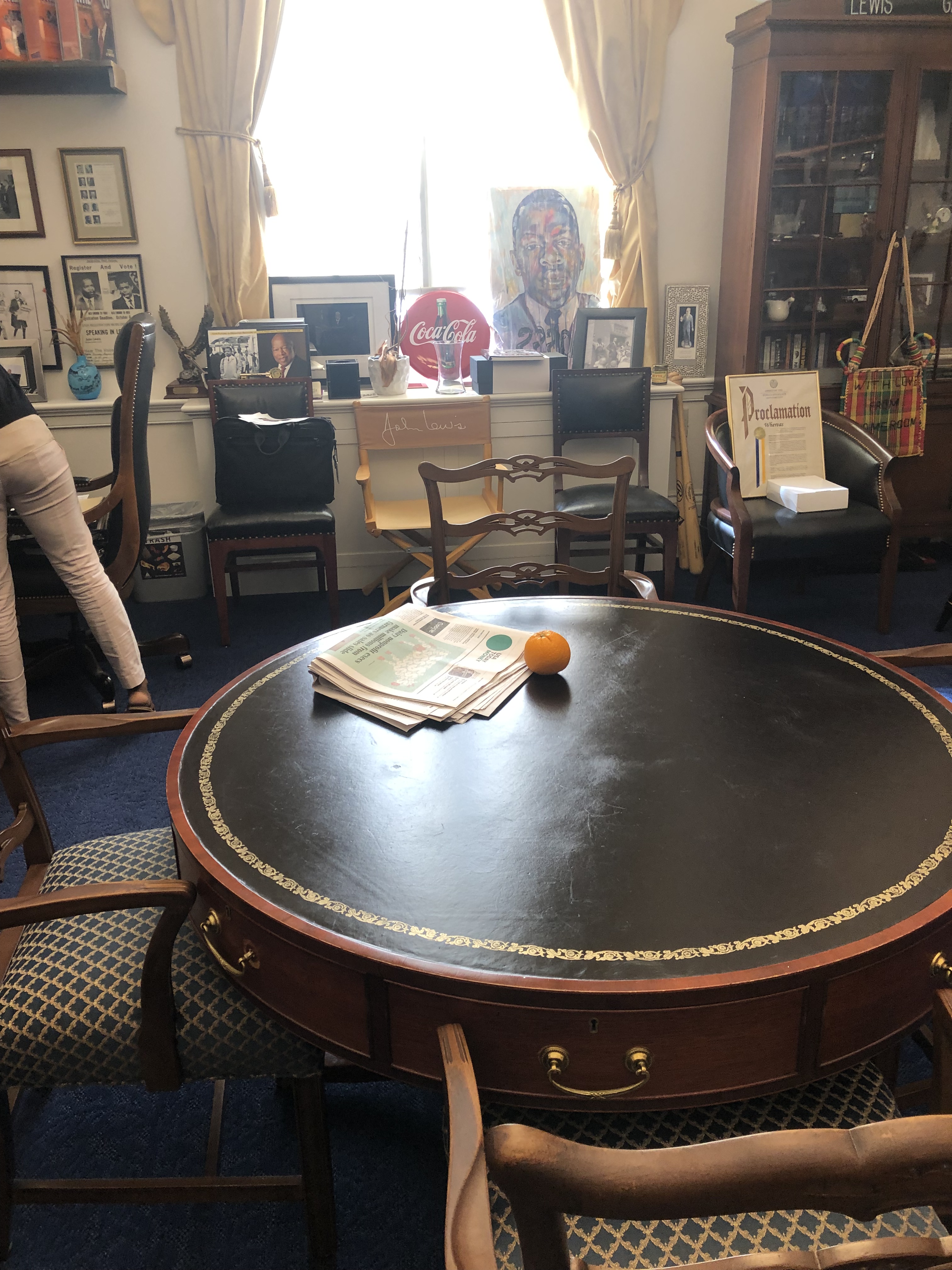 For some reason, I had it in my head that ALL of the House offices were in one building, so I went to that building to find Rep. Lewis’ office. Wouldn’t you know, he was in a completely different building. I was hot, I could barely move, and I was practically dehydrated even though I had been steadily gulping out of my thermos. But I drug my tired, stiff, and sore self over to his office…and I had just missed him. His staffer was kind and let me into his office. I was sweating like a Pentecostal preacher at a tent revival, I could barely get any words out of my mouth, and I was in awe and near tears. Rep. Lewis’ office looks like a Civil Rights museum. In the midst of that museumlike atmosphere, there was a small table with a copy of USA Today and an orange sitting on it; CNN was on the television. I hated that I had missed him, but honestly, I don’t think that I could have held it together if I had seen him and I would’ve been a sweating, bawling, head wrap drooping mess.