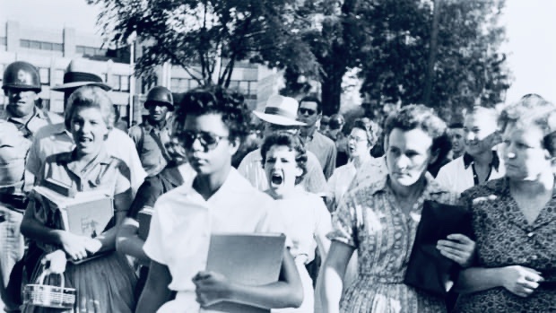 Distorted white faces contorted in anger and rioting. Is this 1957 or is it 2017?
